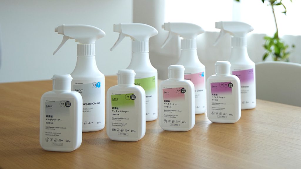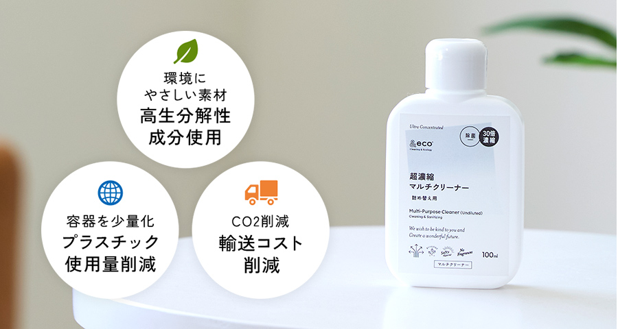「&eco」は、こうした家庭の悩みを解決するため、100mlの小瓶に洗浄成分を極限まで凝縮した「超濃縮洗剤シリーズ」を開発。一般的な300mlスプレー10本分に相当する洗浄液を手のひらサイズでストックできる、現代の住宅事情に最適な「スペパ(スペースパフォーマンス)」に優れた製品を実現しました。