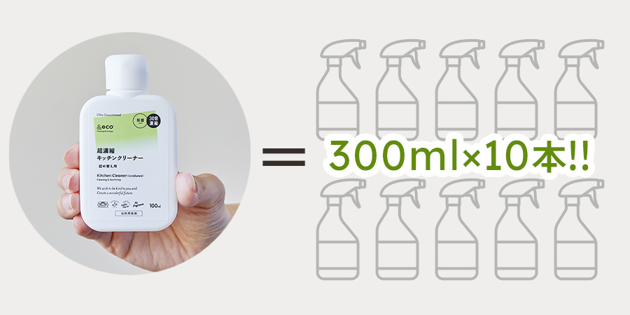 100mlのボトル1本から、約300mlスプレー10本分の洗浄液を作ることができます。